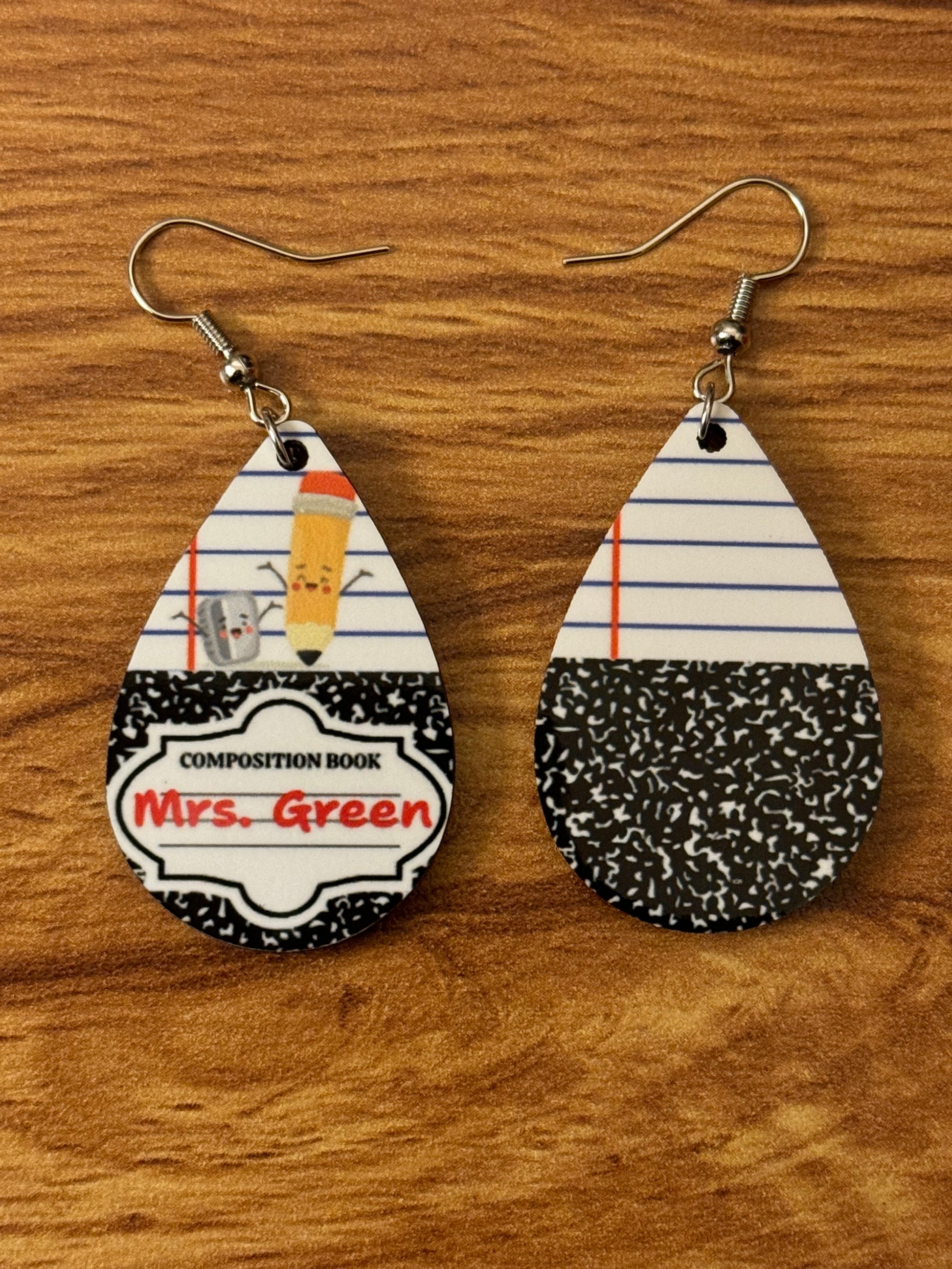 Custom Teacher Teardrop Earrings – Featuring lined paper on top and a classic composition notebook print on the bottom, these lightweight earrings are personalized with your name for a fun, school-inspired look. Perfect for teachers, students, or back-to-school gifts!